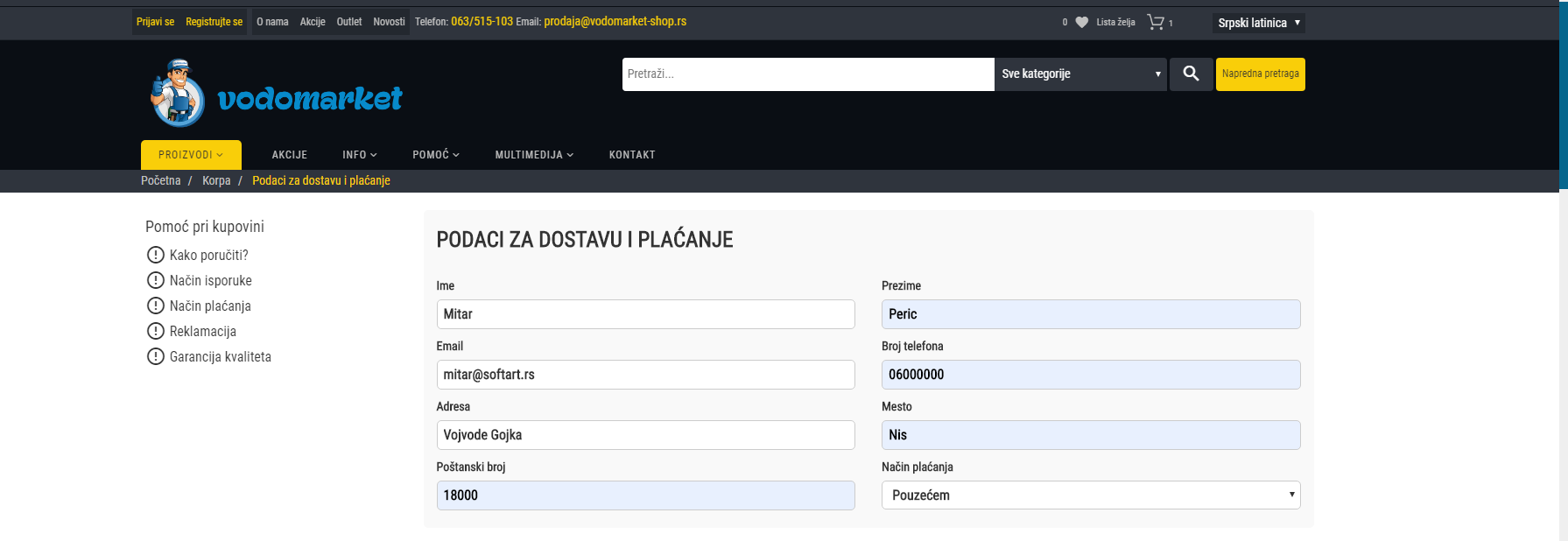 Ukoliko je narudžbina uspešna na Vaš email stićiće Vam poruka sa narudžinom i očekujte da Vas neko konktaktira iz Vodomarketa kako bi potvrdili narudžbinu.