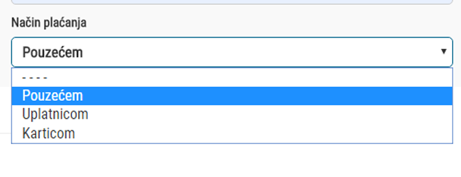 U narednom koraku potrebno je izabrati jedan od tri moguća načina plaćanja: POUZEĆEM (ostali vidovi plaćanja trenutno nisu dostupni).