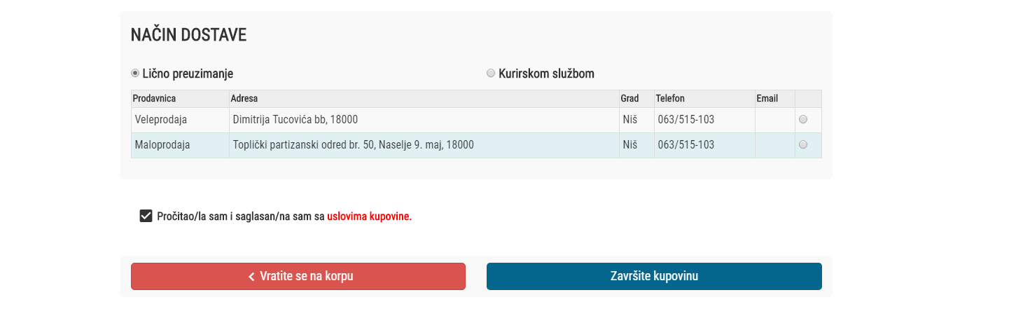 Zatim, izaberite jedan od dva načina dostave LIČNO PREUZIMANJE ILI KURIRSKOM SLUŽBOM, i adresu na koju želite da vam poruđbina stigne.