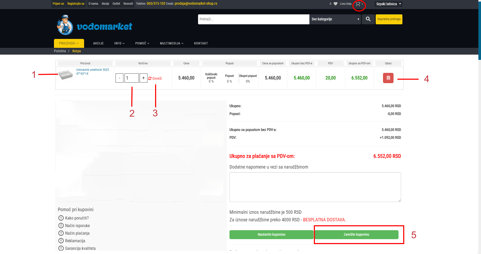 5 - klikom na ovo dugme završavate proces odabira artikla i započinjete proces poručivanja proizvoda iz korpe.